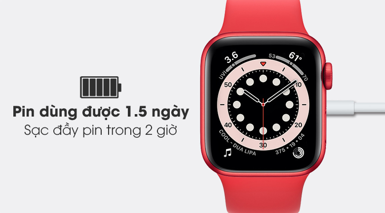 Pin của Apple Watch Series 6 dùng được trong khoảng 1.5 ngày và chỉ cần 2 giờ đồng hồ để sạc đầy pin giúp bạn sử dụng đồng hồ một cách thoải mái, trọn vẹn nhất.