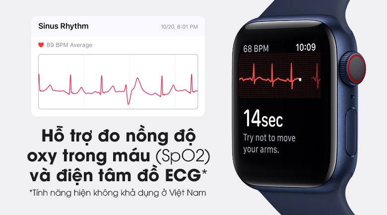 Apple Watch 2020 được trang bị cảm biến SpO2 hỗ trợ người dùng theo dõi nồng độ oxy trong máu định kỳ, ngay cả khi bạn đang ngủ. Bên cạnh đó, thiết bị này còn được hỗ trợ đo điện tâm đồ ECG giúp bạn chăm sóc sức khỏe của mình tốt hơn.