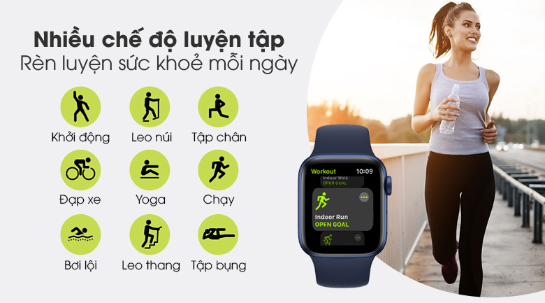 Được tích hợp nhiều chế độ luyện tập khác nhau. Bao gồm các bài luyện tập từ cơ bản đến nâng cao, Apple Watch S6 LTE có các bài tập mới như nhảy, Core Training, Cooldown, tập cơ bắp, ... giúp bạn có những bài tập khoa học để nâng cao sức khỏe.
