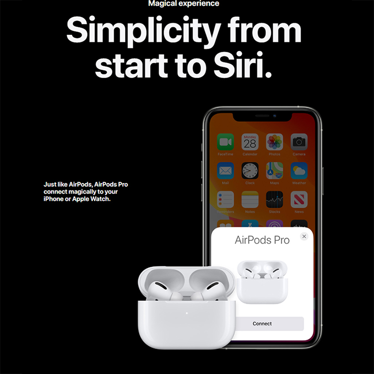 Tai nghe Apple AirPods Pro vẫn sở hữu tính năng kết nối với iPhone hoặc Apple Watch như các mẫu tai nghe AirPods khác, kết nối bluetooth 5.0. Ngoài ra, tai nghe còn tính năng “Hey Hey Siri” giúp kiểm soát âm lượng, cuộc gọi, nghe nhạc và nhiều hơn thế nữa chỉ bằng giọng nói. Đồng thời, tai nghe còn có khả năng chi sẻ bài hát, podcast qua một tai nghe AirPods khác với tính năng chia sẻ âm thanh.