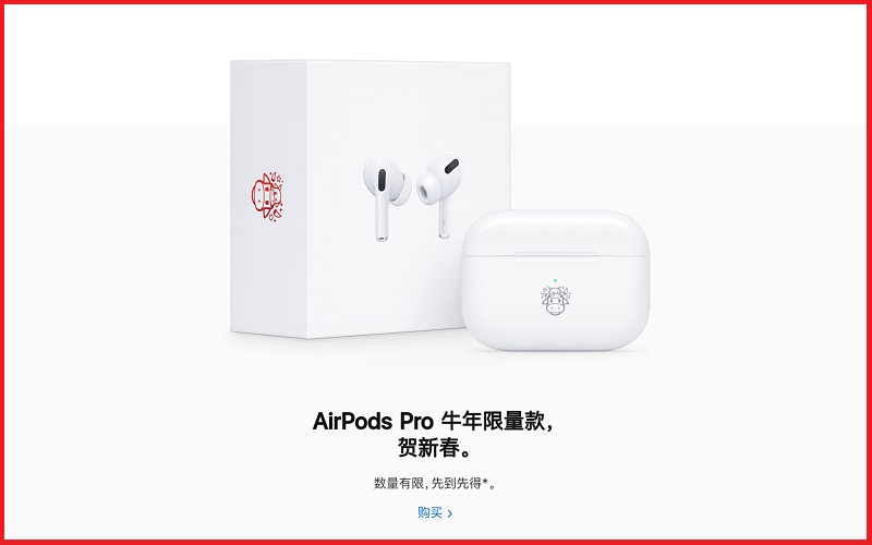 Để chào mừng năm mới, Apple đã giới thiệu phiên bản giới hạn của AirPods Pro và hiện đã có sẵn tại nhiều quốc gia châu Á bao gồm: Trung Quốc, Hồng Kông, Singapore, Đài Loan và Malaysia. Năm mới sắp tới là năm Tân Sửu, nên nhà Táo đã cách điệu logo in trên vỏ thiết bị với biểu tượng hình chú bò rất đáng yêu.